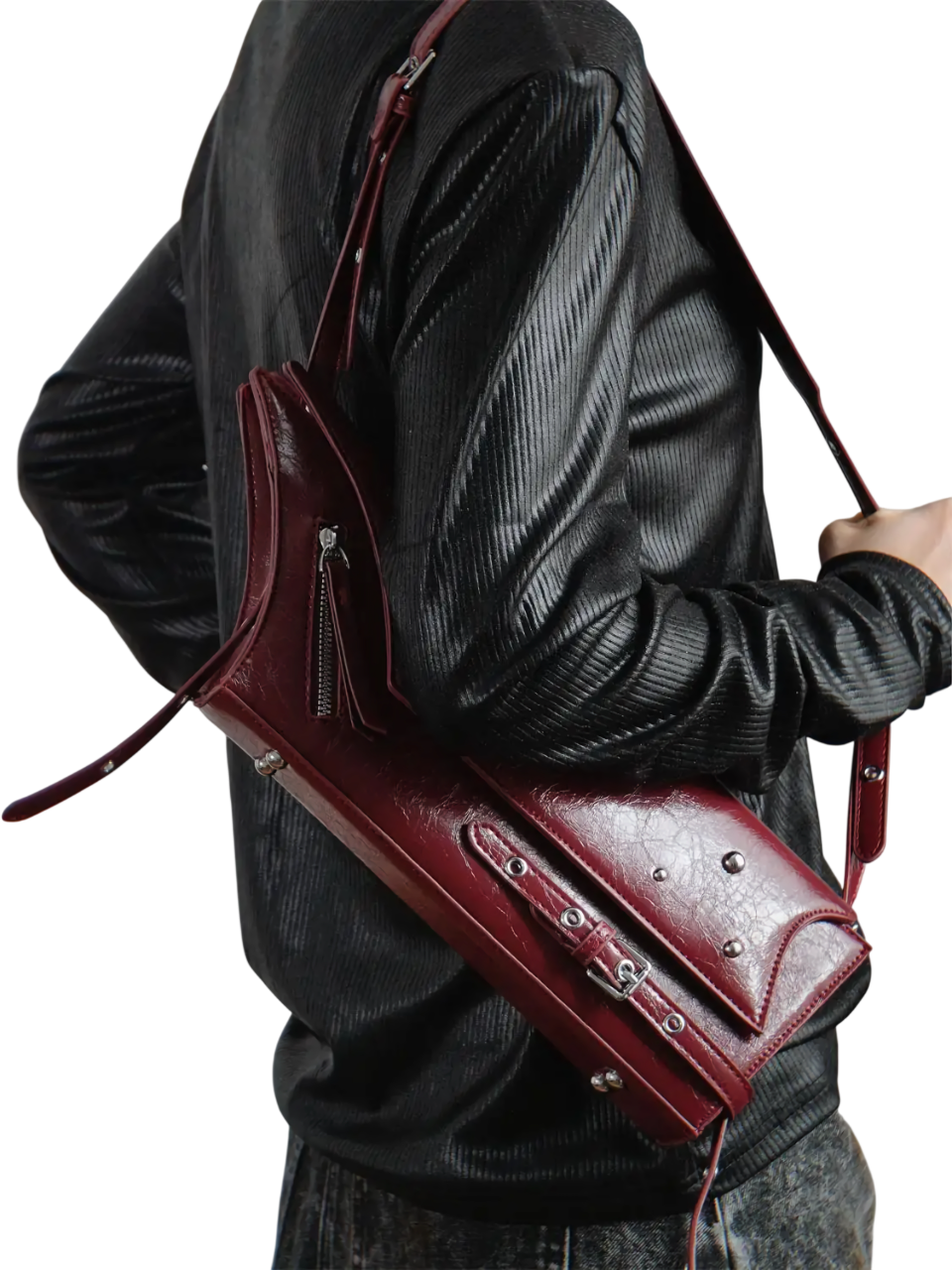 • Burgundy or black vegan leather