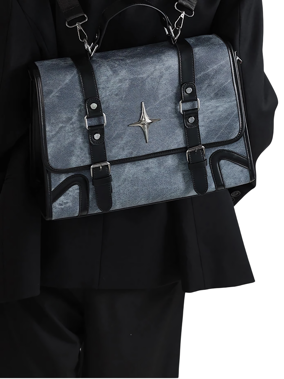 Smooth with a lightly rugged finish that helps stand up to everyday scuffs, finished with buckle straps and a metallic star detail. Pair with straight-leg pants and chunky shoes.